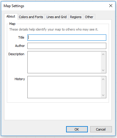 La sección "Map settings" de la aplicación Trizbort incluye un formulario con los campos "Title", "Author", "Description" y "History" que Triz2DAAD consultará para las pantallas de presentación del juego (presentando mensajes por defecto si estuviesen vacíos). "History", que se supone será usado como una pequeña introducción de la historia, no existe en Trizbort.io, con lo que se usará el mensaje por defecto que el autor podrá editar en el código fuente resultante en el mensaje nº 14 de la seccióin /MES.