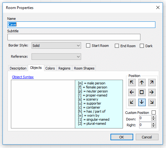 El cuadro de diálogo de los objetos incluye en Trizbort una serie de prefijos para indicar posibles atributos. De ellos Triz2DAAD está preparado para entender [w] (ropa), [c] (contenedor), [f] (femenino) y [2] (plural).