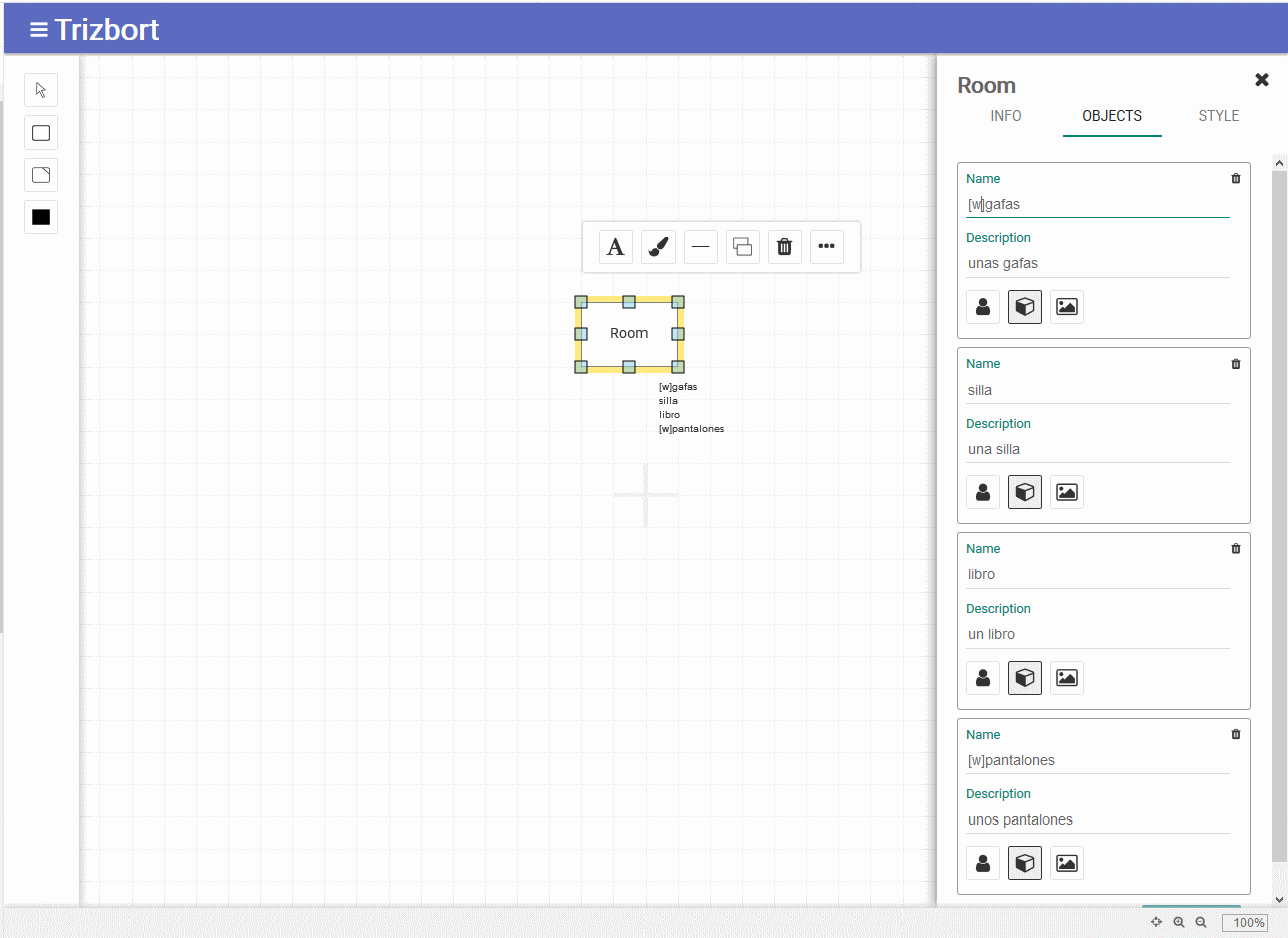 Estos prefijos no se usan, sin embargo, en Trizbort.io. En este caso, Triz2DAAD reconocerá. si se usaran, los prefijos [w] y [c], pero el texto para OTX se tomará del campo "description" (a su vez inexistente en el Trizbort de escritorio) donde se recomienda poner la combinación de nombre y artículo adecuada ("un libro", "una botella"...)